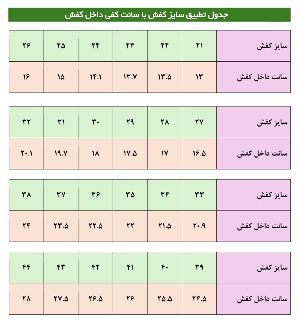 مرحله 5: عدد به دست آمده را با جداول تطبیق سایز و سانت کفی داخل کفش، مقایسه نموده و نزدیکترین سانت (در صورت نیاز عدد حاصله را به بالا گرد می کنیم) کفی داخل کفش را به عدد حاصله از مرحله 4 انتخاب کنید و در انتها سایز مورد نظر شما به دست می آید.